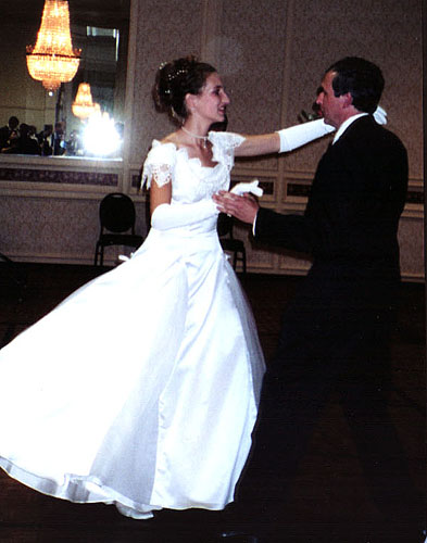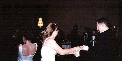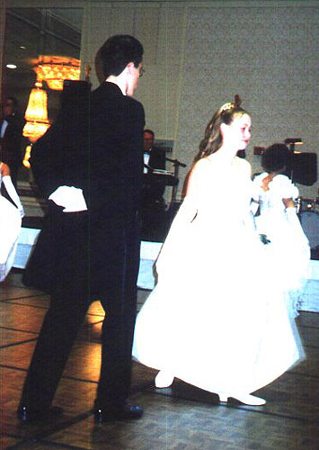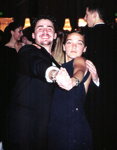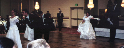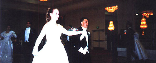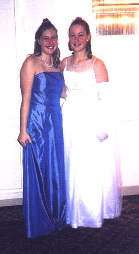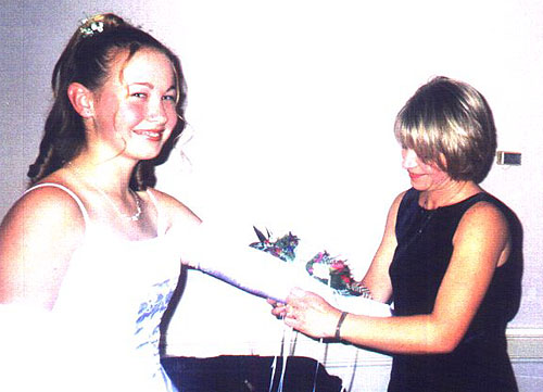 | Prior to the opening dance, Annette's corsage is adjusted by Evi, who taught the opening dance this year. |