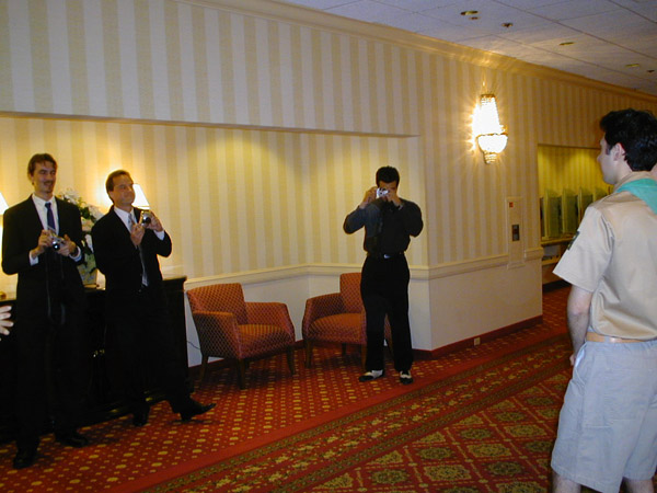 | Tom and Julcsi getting ready to present the flowers and jug to Csaba ba and Emoke neni. (Thanks Mo!) |