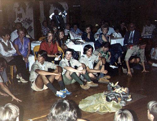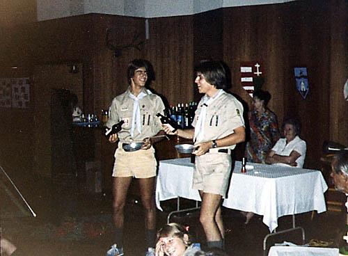 Those are some cool blue shoes. These guys are doing a skit about the ill effects of alcohol. He holds the flag quite proud.