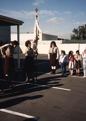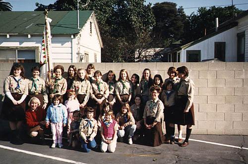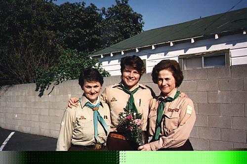 The past three leaders of troop 49 pose for a picture. The entire troop 49 take a group picture together. The announcements are read while everyone listens.