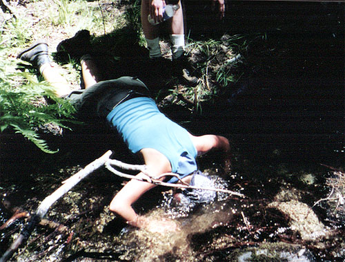 | Passing everyone's things over the creek. |