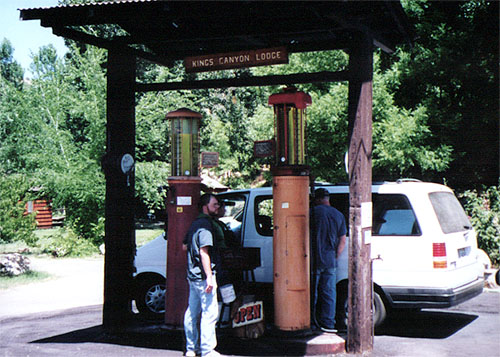 | Mano in front of the only gas pumps in Kings Canyon, which can be considered antiques. |