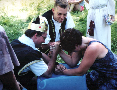 | Arpad officiates as Charles Robert (Gabor) and Iron (Andrea) arm wrestle. |