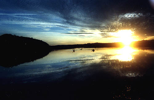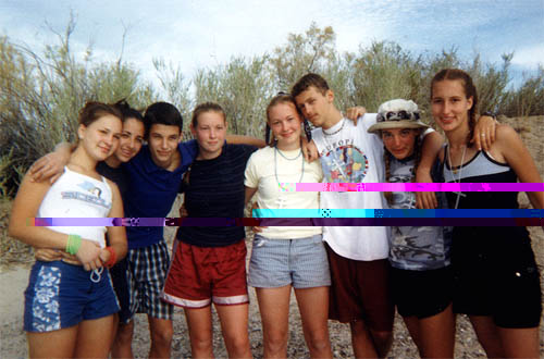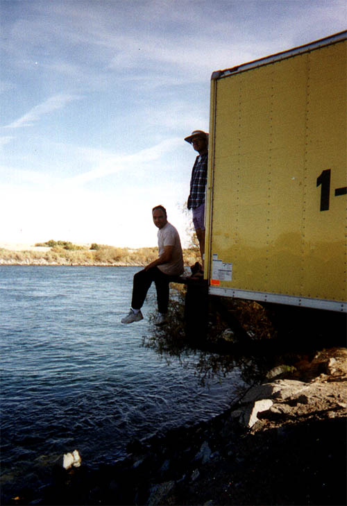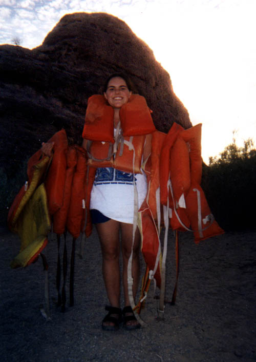 Everyone is friends here. 1999 Canoe Trip group picture. Nobody messes with big Tzanna. Nobody is going to drown with her on watch. Lunch is consumed on the bank of the Colorodo River. Sunsets are quite picturesque over the river. Arpard show us how to make a wharf using nothing more than a Ryder(tm) truck.