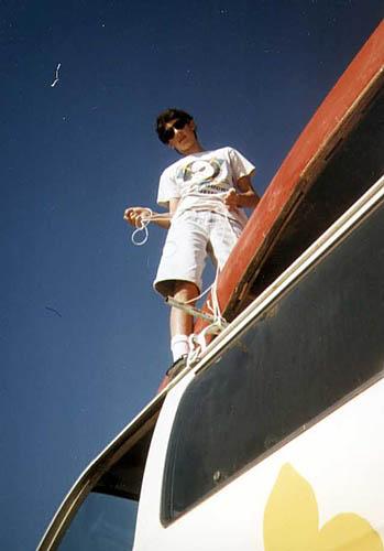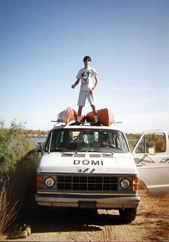 | Tom stands high atop the L.A. Cserkesz Van, which bears the name Dömi. |