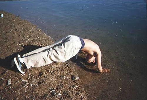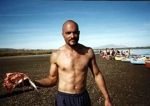 | Arpad holds the dead carcass of a fish. |