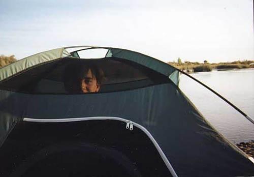 | Zoli looks out of the tent. |