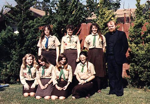 | Here is a group of girls poses for a group photo with a priest. |