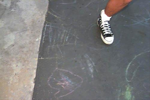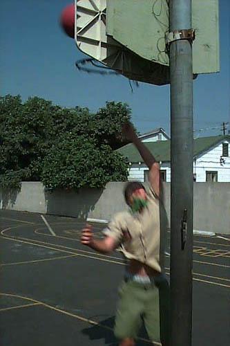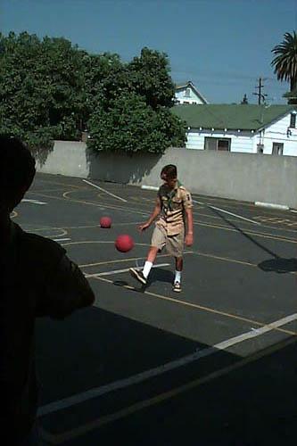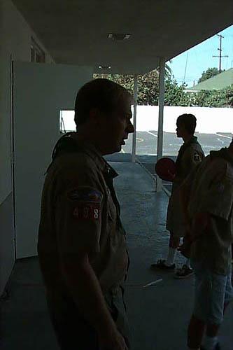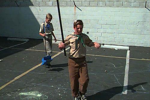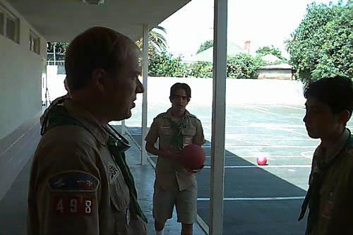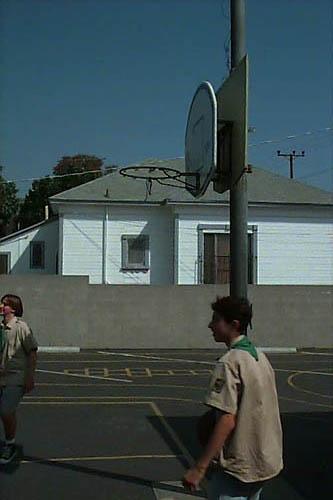 | Scouts converse silhouetted in the foreground looking out at the playground. |