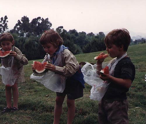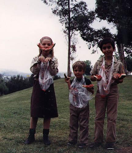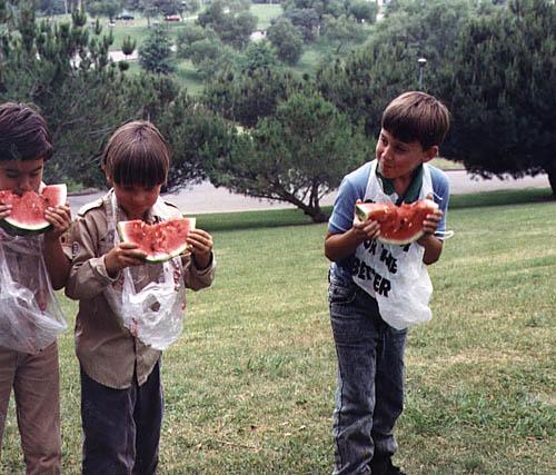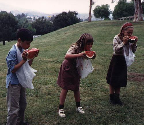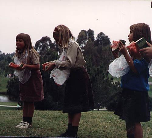 | Three contestants eating away in the water melon eating contest. |