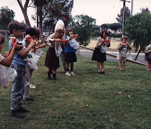 | The whole line of contestants in the water melon eating contest. |