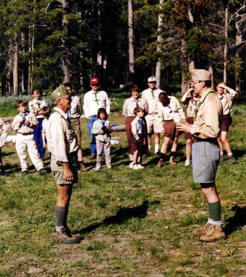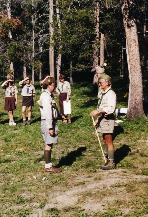 | Scoutmaster Csaba gives an award to fellow leader Gyuri. |