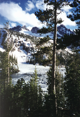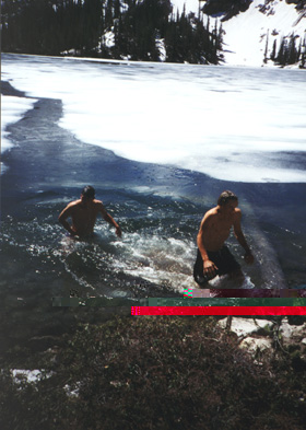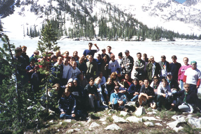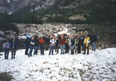 | A group picture of the hikers with frozen Toxaway Lake in the background. It's July. |