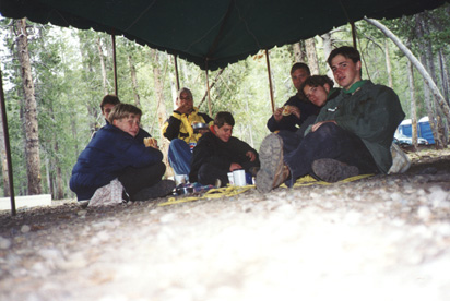 | The Sas and Nomád Õrs eating lunch while it rains outside the tent. |